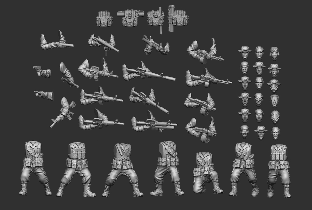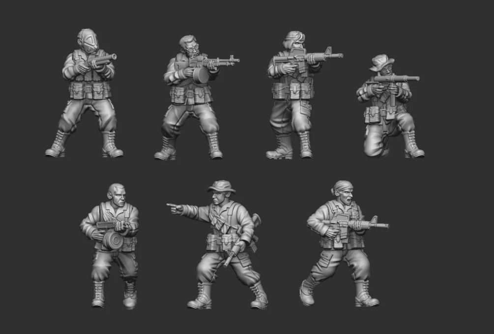 Included is files to print 1 modular squad of MACV SOG Operators. Armed to the teeth with suppressed M16's, CAR15's, chopped RPD's, Stoner LMG's, M79 grenade launchers and Anti Tank rockets.