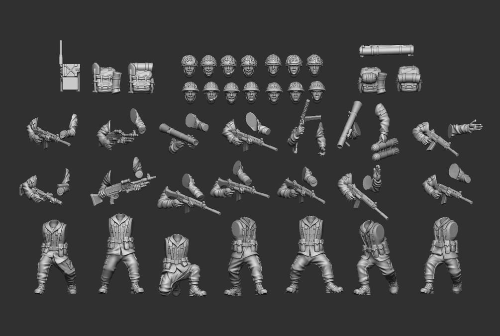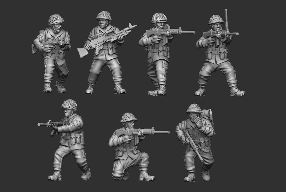 Included will be files to print 1 modular squad of British Infantry modeled around the Cold War era. Included is multiple head options, and weapon options to outfit your squads how you want to!