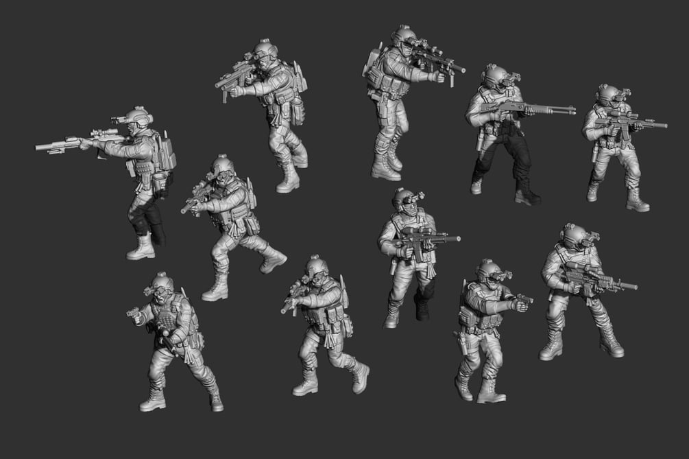 This USMC squad includes 11 highly detailed miniatures with multiple head and pose options. These Marines are outfitted with the latest and greatest weaponry and tech including the M27IAR with Trijicon VCOG variable scope, IR lasers and suppressors, Binelli M4 for those close encounters, M320 grenade launchers, HK-417 DMR's, Sig handguns and the MK46 LMG.