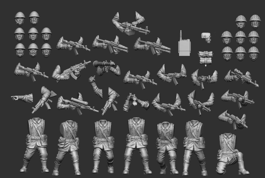 Included will be files to print 1 modular squad of Soviet Motostrelki modeled around the Cold War era. Included is multiple head options, and weapon options to outfit your squads how you want to!