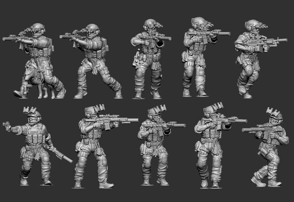 Included is options to assemble basic assaulters with HK416's to a dog handler. Again, included will be 11 different head sculpts, 10 leg options, 10 torso options and a tactical K9!