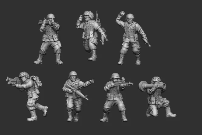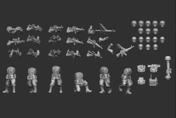 Included will be files to print 1 modular squad of US infantry modeled around the Cold War era. Included is multiple head options, and weapon options to outfit your squads how you want to!